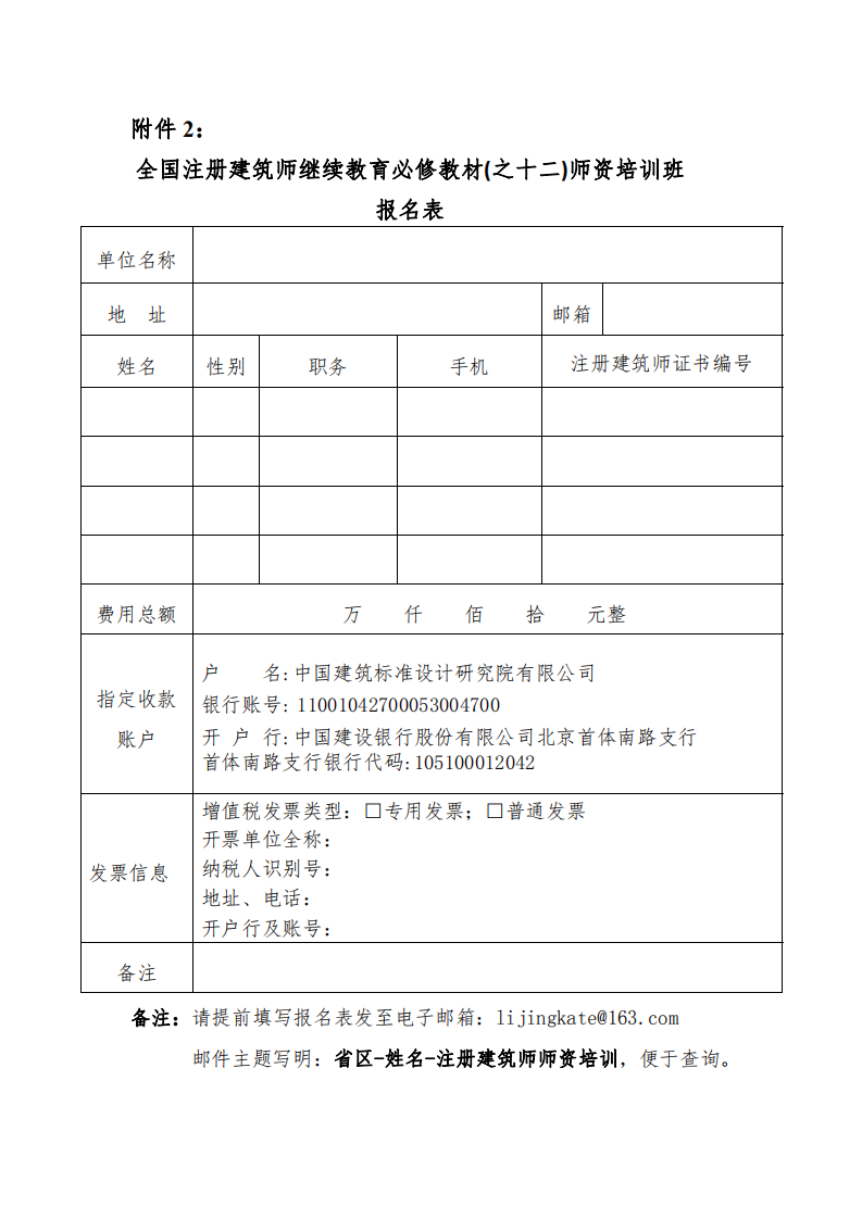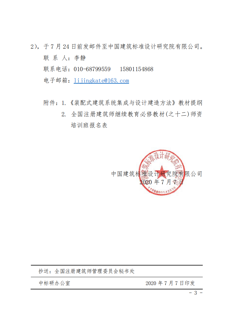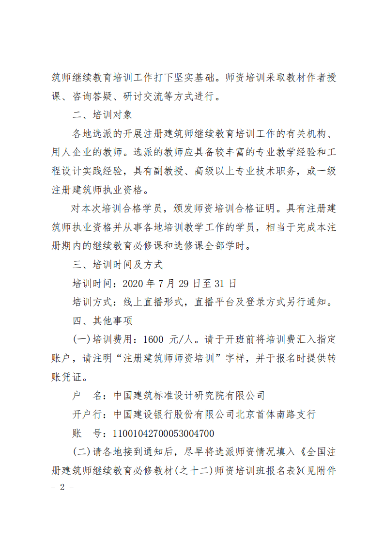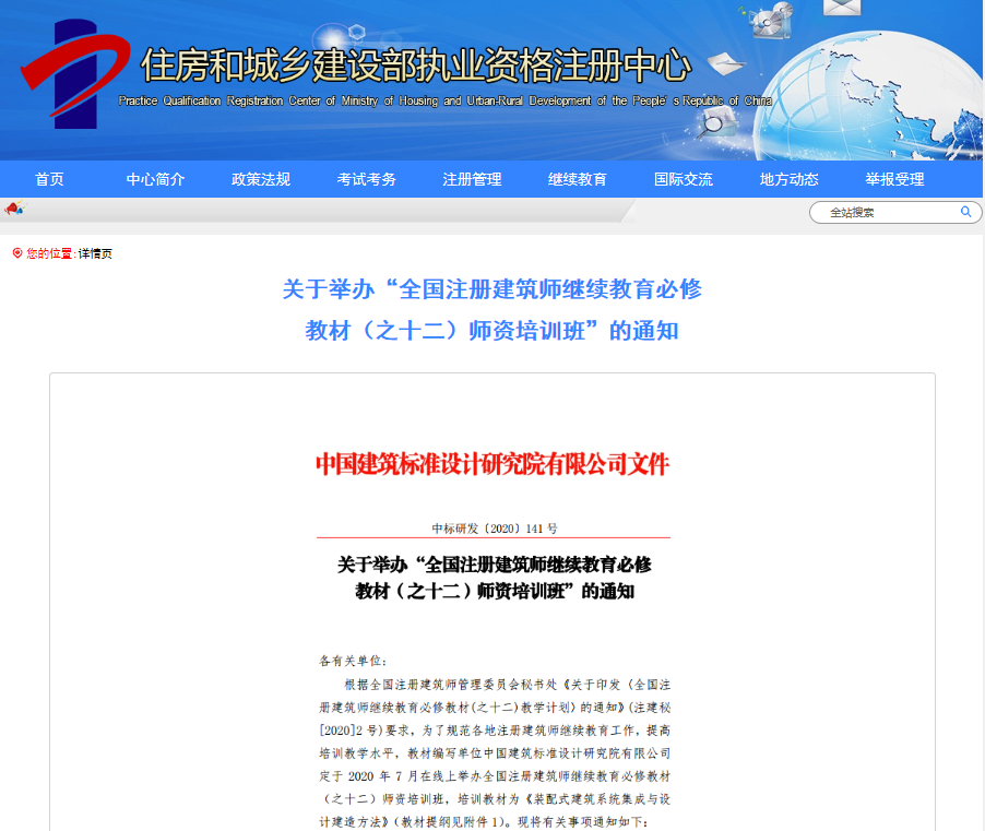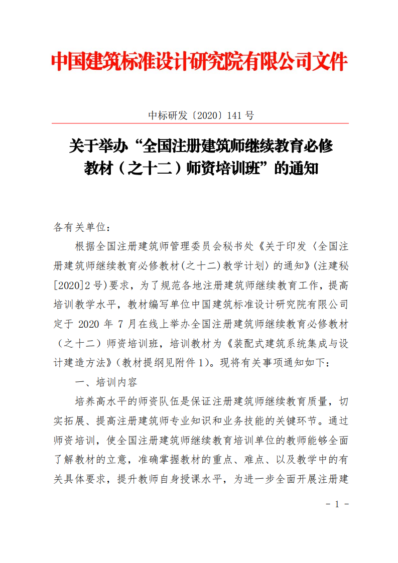 根据全国注册建筑师管理委员会秘书处《关于印发〈全国注册建筑师继续教育必修教材(之十二)教学计划〉的通知》(注建秘[2020]2号)要求,为了规范各地注册建筑师继续教育工作,提高培训教学水平,教材编写单位中国建筑标准设计研究院有限公司定于2020年7月在线上举办全国注册建筑师继续教育必修教材(之十二)师资培训班(中标研发[2020]141号),培训教材为《装配式建筑系统集成与设计建造法》。师资培训采取教材作者授课、咨询答疑、研讨交流等方式进行。